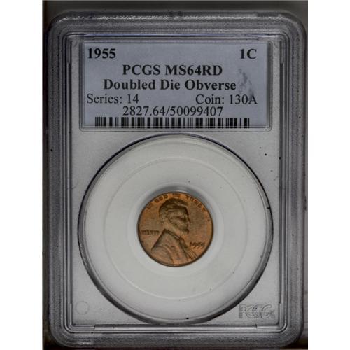 <B>1955/55<1C> Doubled Die Obverse MS64 Red PCGS.</B></I> Very few of these have been certified as having fully brilliant red color as nearly all spent a short time in circulation before being rescued by the numismatic world. The variety received wide spread publicity beginning in 1956. This example is sharply struck and fully lustrous with mellow orange mint color. A few insignificant spots and abrasions limit the grade and keep this cent out of the Gem category.<BR><I>From The Kendall Marie #4 All-Time Finest PCGS Registry of Lincoln Cents with Varieties, Circulation Strikes, 1909-1958.</B></I> <BR><BR><B>Important notice:</B> Heritage usually auctions material at the rate of 200-250 lots per hour. On some occasions eBay Live bid software or the Internet may not be able to keep up with the pace of the auction. We recommend placing a realistic absentee bid now as insurance to avoid disappointment. Occasionally the auctioneer may eliminate or reject an eBay Live bid, and the auctioneer may also reopen a lot after the close of the eBay live bidding (usually because we missed an audience bid), and may reject your bid even if it shows you as the winning bidder. By bidding via eBay Live, you agree that Heritage may award the lot to another bidder at its sole discretion under the circumstances described above or any other reasonable circumstances. Since eBay bids are not shown to us until we open the lot on the floor, we treat those bids just like floor bids. In most cases the floor responds before the eBay bid is presented to us, due to Internet lag time, so for consistency we have made it a policy that floor bids are always considered first over tie eBay live bids. Also please note that all Heritage lots purchased through eBay Live carry a 20% Buyer's Premium. Please make sure you read the Terms and Conditions before you bid. This lot is being auctioned in conjunction with a live floor auction by Heritage Galleries & Auctioneers. All final auction and invoice information will be supplied by Heritage Galleries & Auctioneers, and all other information should be considered preliminary. Lot:583 <BR><BR><B>Winning Notification and Billing:</B> After the FINAL session in this auction is complete, Heritage will send e-mail and snail mail invoices. This process normally takes several days. All final auction and invoice information will be supplied by Heritage Galleries & Auctioneers, and all other information should be considered preliminary. <BR><BR>This auction will be conducted on a live auction floor and over the Internet through eBay Live. If you choose to place an absentee bid, please take a moment to <font color='#0000ff'><u><a href='http://pages.ebay.com/liveauctions/help/before/laabsentee.html'>learn how eBay Live absentee bidding works</a></u></font><font color='#000000'>