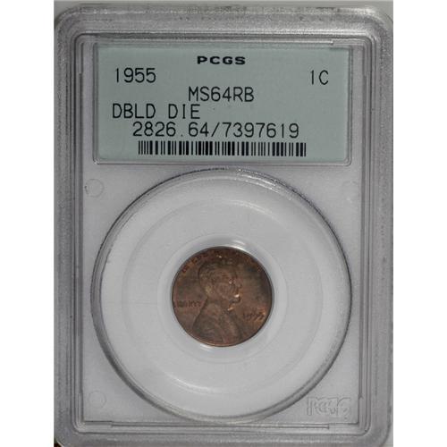<B>1955/55 1C Doubled Die Obverse MS64 Red and Brown PCGS.</B></I> A lustrous and boldly struck representative of this famous and always impressive mint error. Orange-gold is ample, particularly on the obverse, with areas of deep brown also present. Encapsulated in an old green label holder.<BR><BR><b>Shipping:</b> Coin/Currency (<a target="_blank" href="http://www.heritageauctions.com/common/shipping.php">view shipping information</a>)