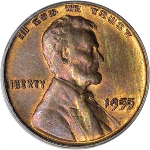 <B>1955/55 1C Doubled Die Obverse MS64 Red and Brown PCGS.</B></I> The first 1955 doubled die specimens turned up in Massachusetts in late 1955, and also in upstate New York. David Lange (2005) writes that: "Quite a few were found sealed within packages of cigarettes dispensed from vending machines. With these packs then priced at 23 cents each, change of a quarter was already provided by the cigarette manufacturer along with the cigarettes to avoid the nuisance of loading cents separately into their machines." Spectacular doubling is readily visible on all obverse letters and digits. Whispers of light tan, sky-blue, and crimson visit copper-gold surfaces that are devoid of blemishes, and a sharp strike results in strong design feature detail.<BR><BR><b>Shipping:</b> Coins & Currency (<a target="_blank" href="http://www.heritageauctions.com/common/shipping.php">view shipping information</a>)