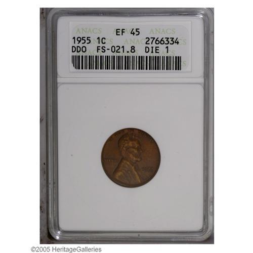 <B>1955/55<1C> Doubled Die Obverse XF45 ANACS.</B></I> FS-021.8. Die #1. Subdued orange-maroon in color with lighter tan highpoints on the portrait. A sharp example of this desirable doubled date.