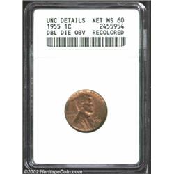 1955/55 1C Doubled Die, Unc Details, Artificial Color, NCS. Just a bit too bright to be natural red color, there are significant portions of brown over each side as well and the coin actually is quite pleasing.From the Robert Tarr, Sr. Collection. Important notice: We expect to be auctioning lots at the rate of 200-250 per hour. Sometimes eBay Premier live bid software cannot keep up with that pace, so we strongly recommend that you place a realistic proxy bid now as insurance to avoid disappointment. Also please note that all Heritage/CAA lots purchased through eBay Premier carry a 20% Buyer's Premium. Please make sure you read the Terms and Conditions.