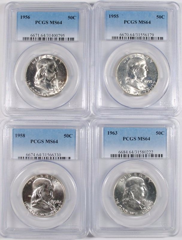 1955, 56, 58 & 63 FRANKLIN HALF DOLLARS, PCGS MS-64