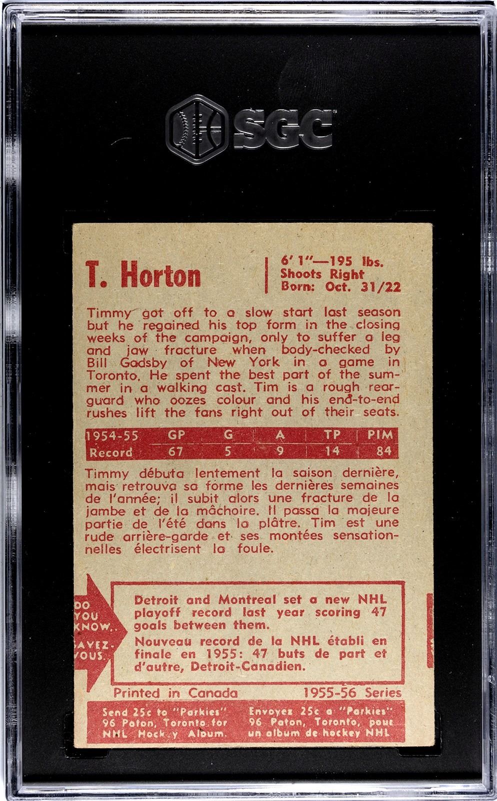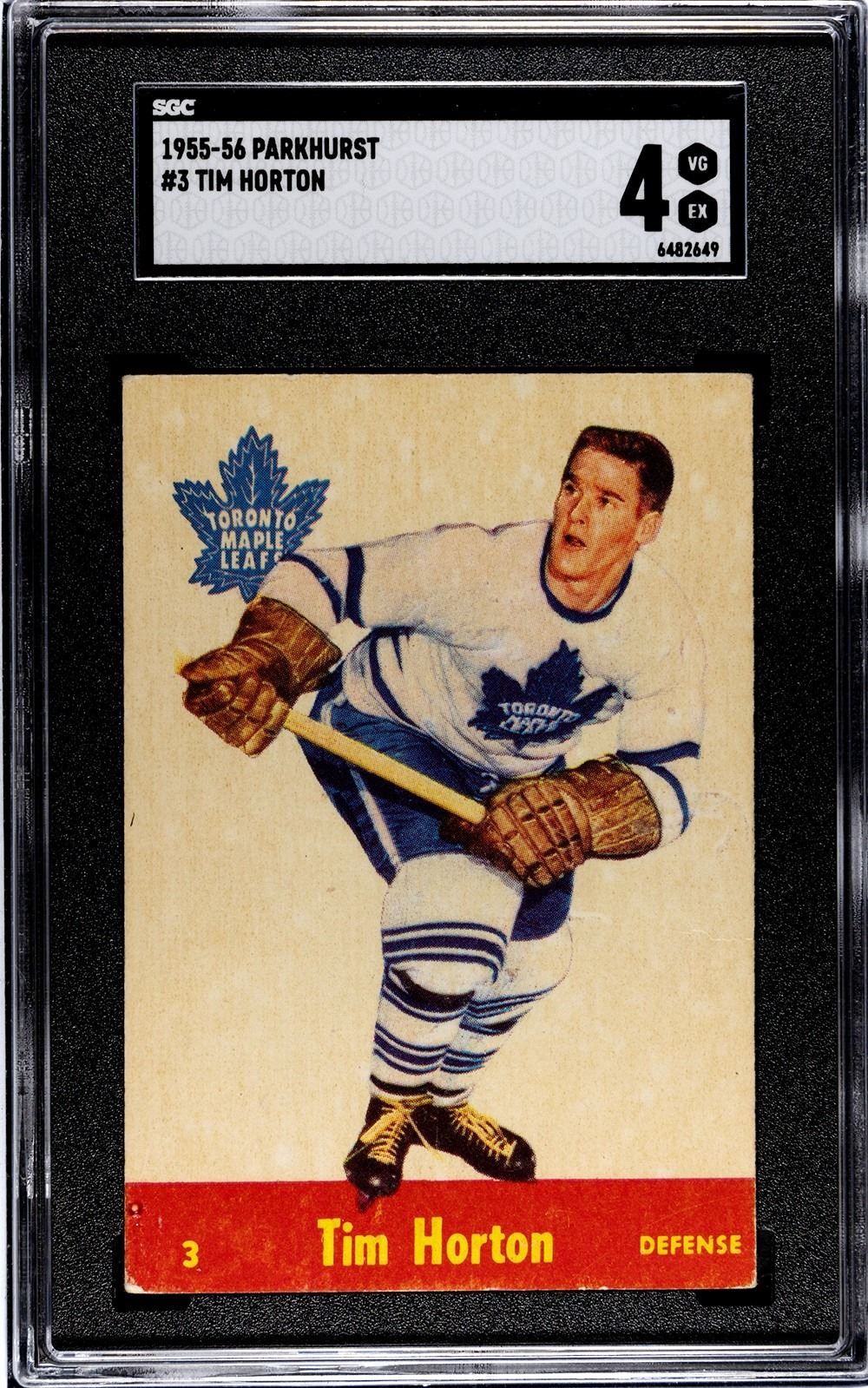 One of the more collectible Horton cards, from the classic 1955 Parkhurst set. HOFer, 20-year Maple Leaf star, graded 4 VG-EX by SGC.