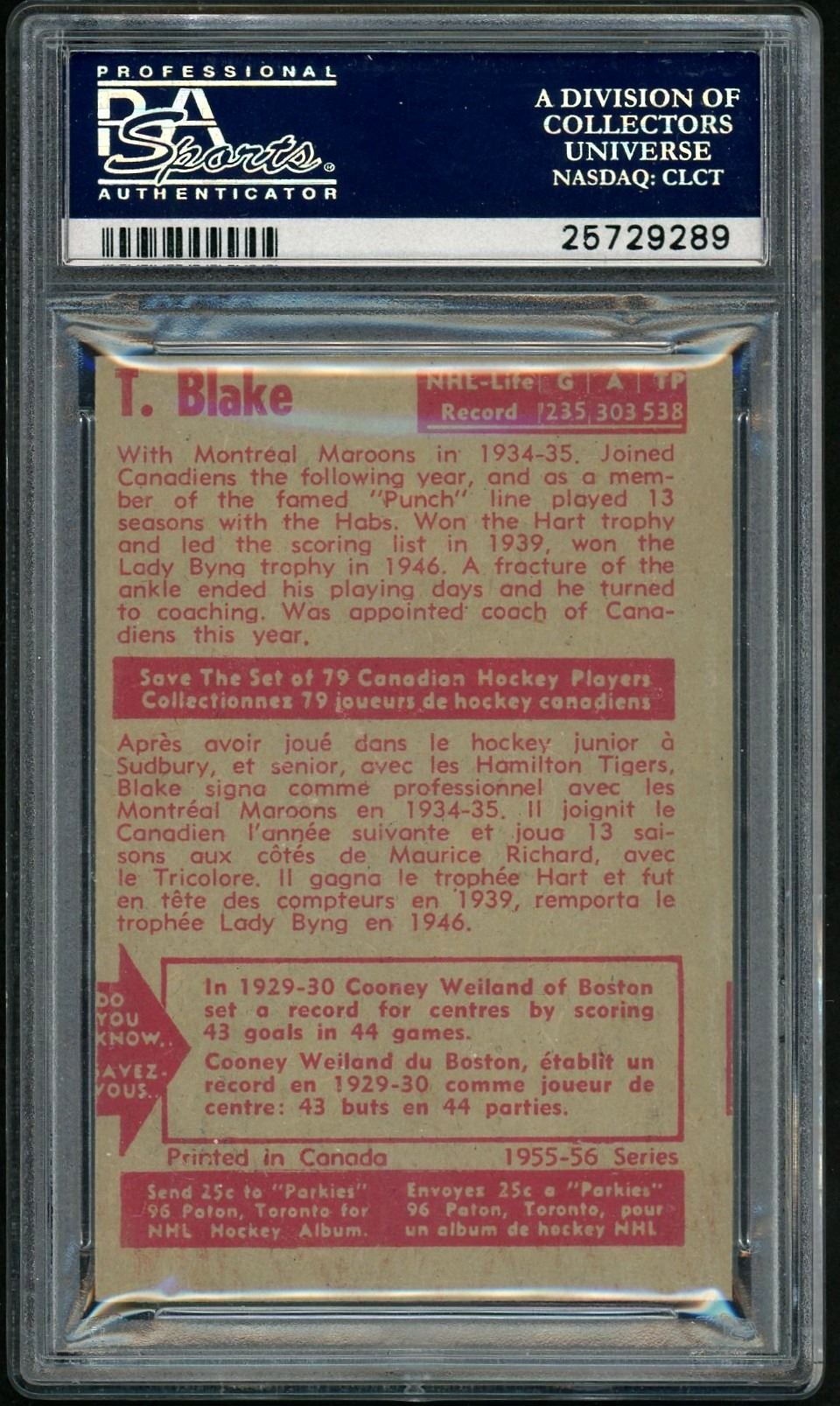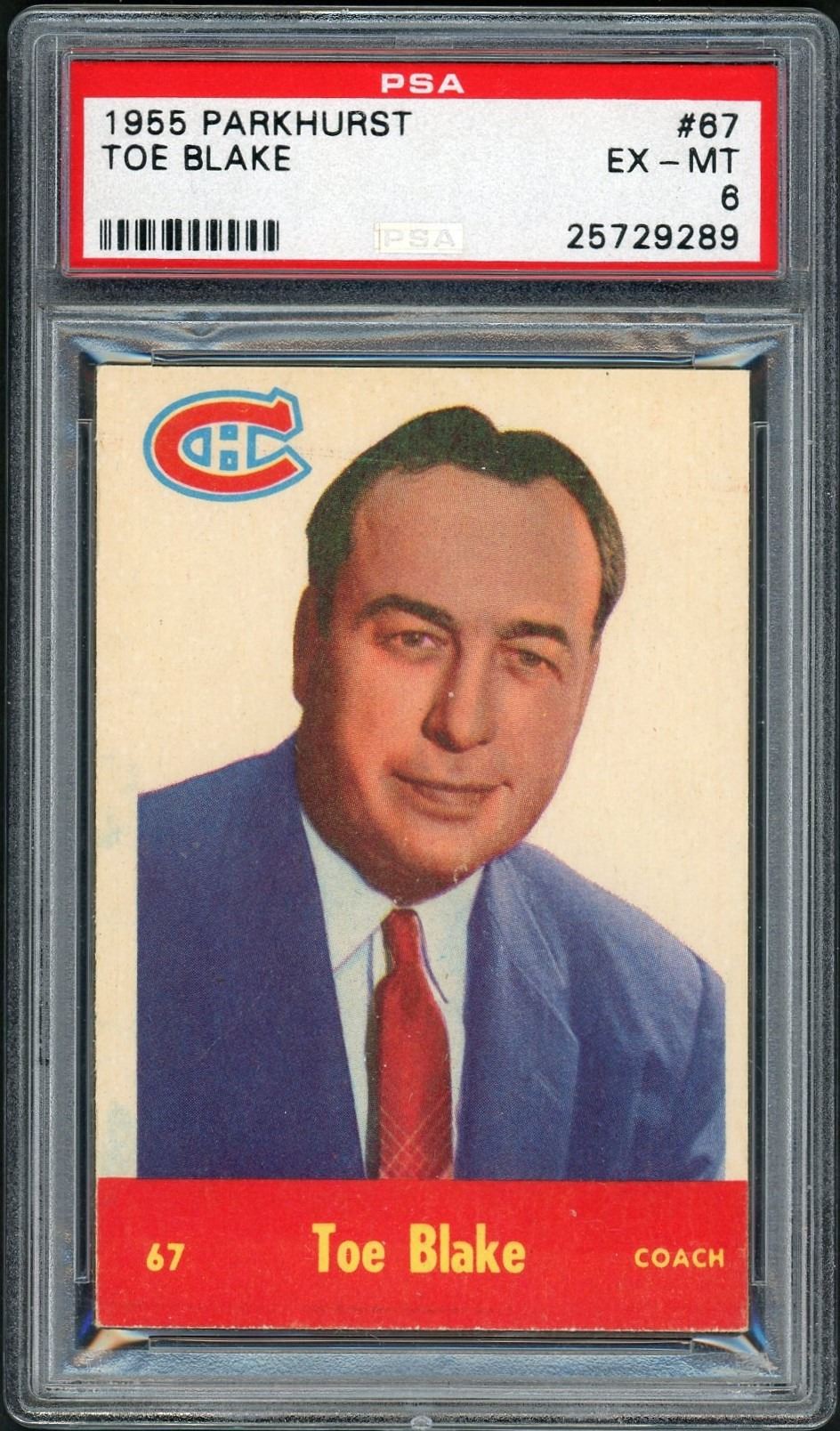 Old time hockey with Toe Blake! One of the few in hockey history who are both Hall of Famers due to their playing success and their coaching success. As a player, Blake was a 5x all-star (3x 1st team), league MVP (1939), scoring champ (1939), and Lady Byng winner (1950). As a coach, he won 500 of 914 career games, and an amazing eight Stanley Cups. From the classic 1955 Parkie set, grading a nice 6 EX-MT by PSA.