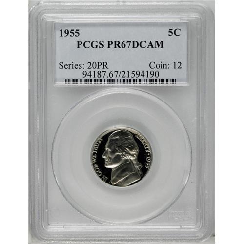 <B>1955<5C> PR67 Deep Cameo PCGS.</B></I> A remarkable example with fully brilliant surfaces, deeply mirrored fields, and highly lustrous devices. <BR><BR><B>Important notice:</B> Heritage usually auctions material at the rate of 200-250 lots per hour. On some occasions eBay Live bid software or the Internet may not be able to keep up with the pace of the auction. We recommend placing a realistic absentee bid now as insurance to avoid disappointment. Occasionally the auctioneer may eliminate or reject an eBay Live bid, and the auctioneer may also reopen a lot after the close of the eBay live bidding (usually because we missed an audience bid), and may reject your bid even if it shows you as the winning bidder. By bidding via eBay Live, you agree that Heritage may award the lot to another bidder at its sole discretion under the circumstances described above or any other reasonable circumstances. Since eBay bids are not shown to us until we open the lot on the floor, we treat those bids just like floor bids. In most cases the floor responds before the eBay bid is presented to us, due to Internet lag time, so for consistency we have made it a policy that floor bids are always considered first over tie eBay live bids. Also please note that all Heritage lots purchased through eBay Live carry a 20% Buyer's Premium. Please make sure you read the Terms and Conditions before you bid. This lot is being auctioned in conjunction with a live floor auction by Heritage Galleries & Auctioneers. All final auction and invoice information will be supplied by Heritage Galleries & Auctioneers, and all other information should be considered preliminary. Lot:1182 <BR><BR><B>Winning Notification and Billing:</B> After the FINAL session in this auction is complete, Heritage will send e-mail and snail mail invoices. This process normally takes several days. All final auction and invoice information will be supplied by Heritage Galleries & Auctioneers, and all other information should be considered preliminary. <BR><BR>This auction will be conducted on a live auction floor and over the Internet through eBay Live. If you choose to place an absentee bid, please take a moment to <font color='#0000ff'><u><a href='http://pages.ebay.com/liveauctions/help/before/laabsentee.html'>learn how eBay Live absentee bidding works</a></u></font><font color='#000000'>