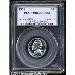 <B>1955<5C> PR67 Deep Cameo PCGS.</B></I> The frosty designs appear to float on the inky-black watery fields. This coin is as close to perfection as one can be, with virtually no abrasions, spots, or hairlines. <BR><BR><B>Important notice:</B> Heritage usually auctions material at the rate of 200-250 lots per hour. On some occasions eBay Live bid software or the Internet may not be able to keep up with the pace of the auction. We recommend placing a realistic absentee bid now as insurance to avoid disappointment. Occasionally the auctioneer may eliminate or reject an eBay Live bid, and the auctioneer may also reopen a lot after the close of the eBay live bidding (usually because we missed an audience bid), and may reject your bid even if it shows you as the winning bidder. By bidding via eBay Live, you agree that Heritage may award the lot to another bidder at its sole discretion under the circumstances described above or any other reasonable circumstances. Since eBay bids are not shown to us until we open the lot on the floor, we treat those bids just like floor bids. In most cases the floor responds before the eBay bid is presented to us, due to Internet lag time, so for consistency we have made it a policy that floor bids are always considered first over tie eBay live bids. Also please note that all Heritage lots purchased through eBay Live carry a 20% Buyer's Premium. Please make sure you read the Terms and Conditions before you bid.
