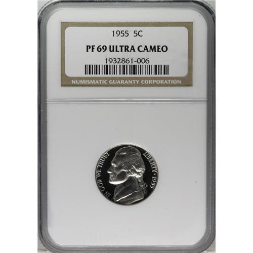 <B>1955 5C PR69 Ultra Cameo NGC.</B></I> Half a century has hardly touched this remarkable specimen. The fields retain the same fathomless depth they had the day this piece was coined, and the boldly impressed devices have the same mint frost. No toning visits the gleaming surfaces. A great opportunity for the date collector. Census: 7 in 69 Ultra Cameo, 0 finer (11/06).<BR><BR><b>Shipping:</b> Coin/Currency (<a target="_blank" href="http://www.heritageauctions.com/common/shipping.php">view shipping information</a>)