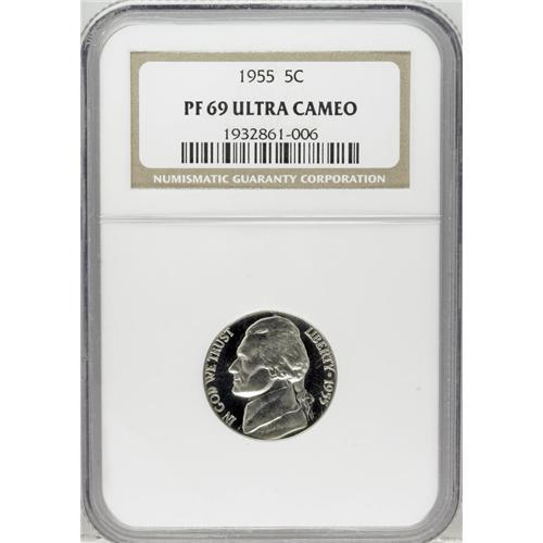 <B>1955 5C PR69 Ultra Cameo NGC.</B></I> The fields of this remarkable specimen exhibit fathomless depth, and present unyielding contrast with the boldly impressed, frosty devices. No toning visits the gleaming surfaces. A great opportunity for the date collector. Census: 7 in 69 Ultra Cameo, 0 finer (1/07).<BR><BR><b>Shipping:</b> Coin/Currency (<a target="_blank" href="http://www.heritageauctions.com/common/shipping.php">view shipping information</a>)