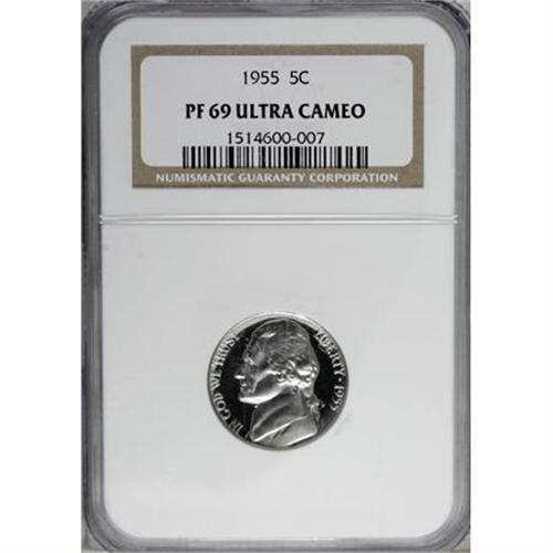 <B>1955 5C PR69 Ultra Cameo NGC.</B></I> Though Ultra Cameo examples of the 1955 nickel are more available than earlier Jefferson nickels, the total population is small nonetheless, particularly in the almost-perfect PR69 Ultra Cameo grade. This essentially untoned specimen has needle-sharp detail and crisp contrast between the deeply mirrored fields and the snow-white devices. Census: 7 in 69 Ultra Cameo, 0 finer (12/07).<BR><BR><b>Shipping:</b> Coins & Currency (<a target="_blank" href="http://www.heritageauctions.com/common/shipping.php">view shipping information</a>)
