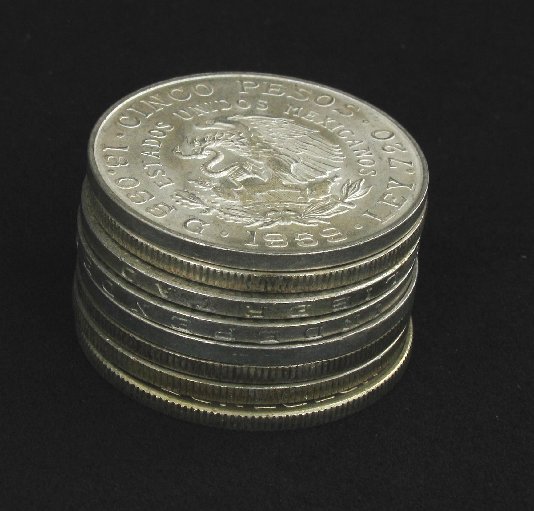 1955-9 Mexico Silver 5 Pesos Unsearched Stack of 8 Mostly BU 3.6 Ounces Silver! (COI-5240)
