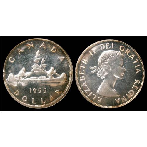 1955 Arnprior $1 PCGS PL-67 A premium quality example. An extraordinary Elizabeth II example in Superb Gem condition. The coin is fully struck and has full lustre. It has reflective surfaces on both the obverse and reverse and superb eye appeal. Ligh