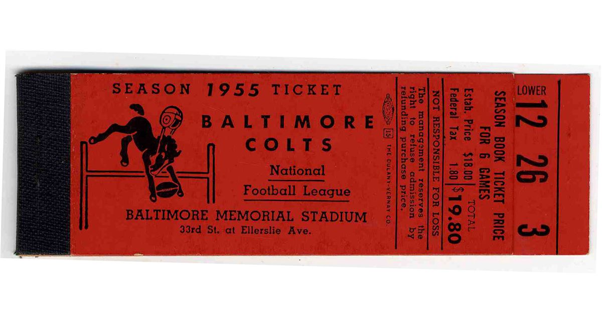 1955 Baltimore Colts Season Ticket Booklet -- All Tickets For Lower Section Seats Removed -- 5.5'' x