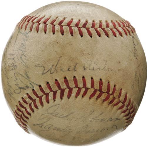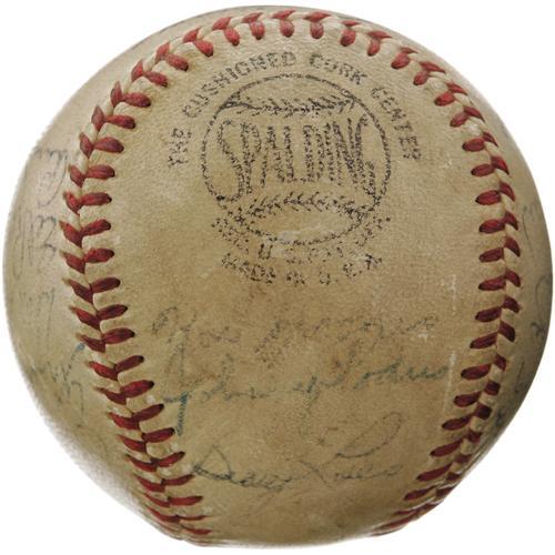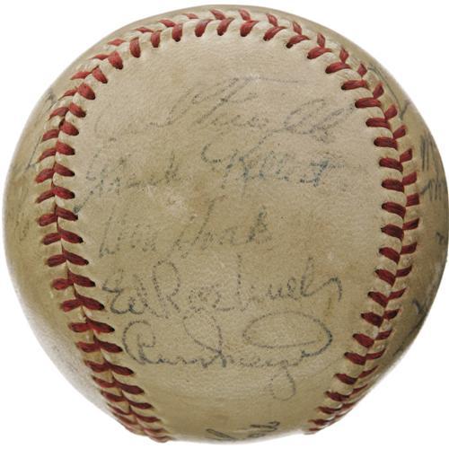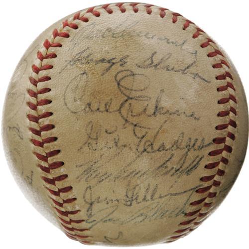<B>1955 Brooklyn Dodgers Team Signed Baseball.</B></I> After decades of singing that common refrain, "Wait 'til next year," the Ebbets faithful were finally rewarded for their patience by this '55 squad. Twenty-two members of Brooklyn's only World Championship squad rally together on this ONL (Giles) ball, serving as a lasting tribute to Flatbush optimism. Notables include Robinson, Campanella, Alston, Furillo, Hodges, Gilliam, Spooner, Hoak and Frank Kellert, whose single season of service to the Bums definitively dates the ball. Typical of Dodgers balls of this era, several clubhouse autographs are found: Reese, Amoros, Podres, Snider, Loes, Roebuck, Meyer, Walker and Hughes. Autograph quality ranges from 4/10 to 8/10, with all but two (no Hall of Famers) in the upper half of that scale. <I>LOA from PSA/DNA. LOA from James Spence Authentication.</B></I><BR><BR><b>Shipping:</b> Balls, Pucks, etc., Small (<a target="_blank" href="http://www.heritageauctions.com/common/shipping.php">view shipping information</a>)