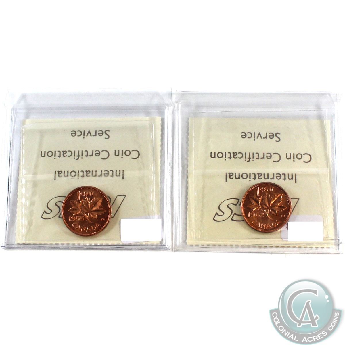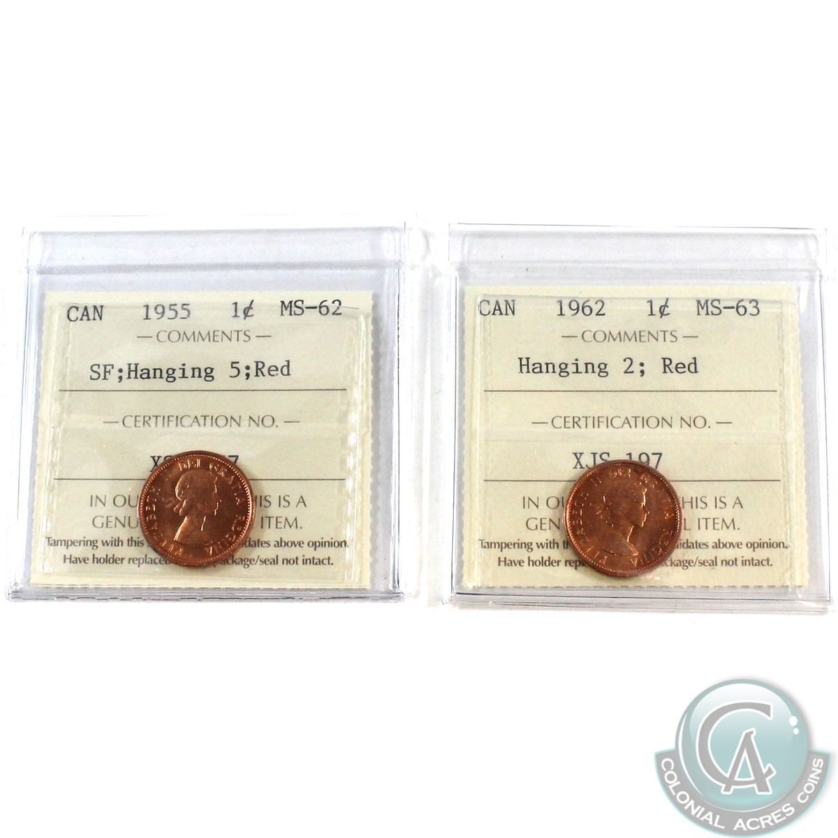 1955 Canada 1-cent SF Hanging 5 ICCS MS-62 Red & 1962 Canada 1-cent Hanging 2 MS-63 Red. 2pcs.