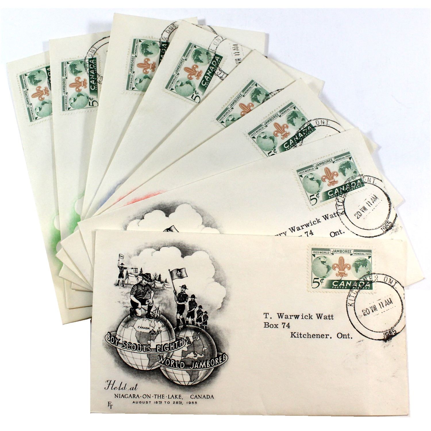 1955 Canada Boy Scout Jamboree First Day Cover Collection. You will receive 2 each of the Black, Green, Red, and Blue. 8pcs.