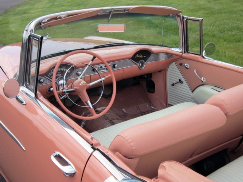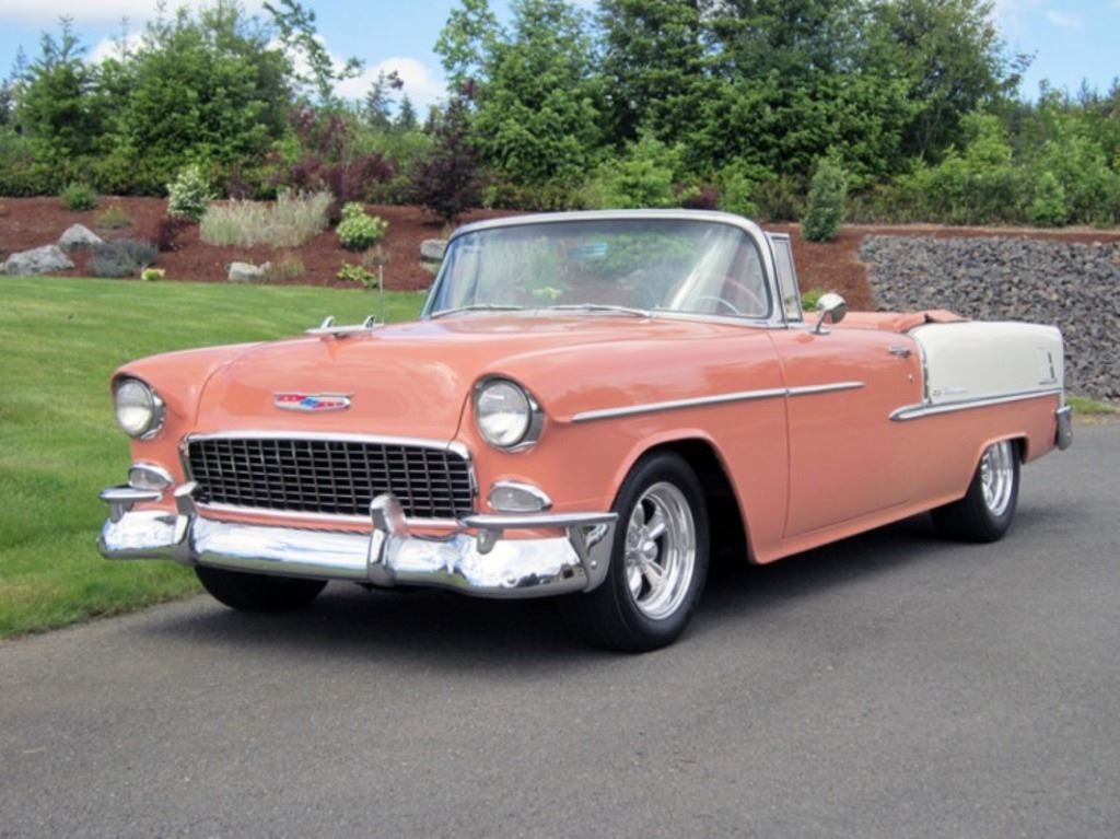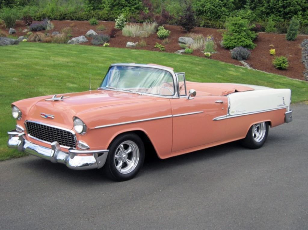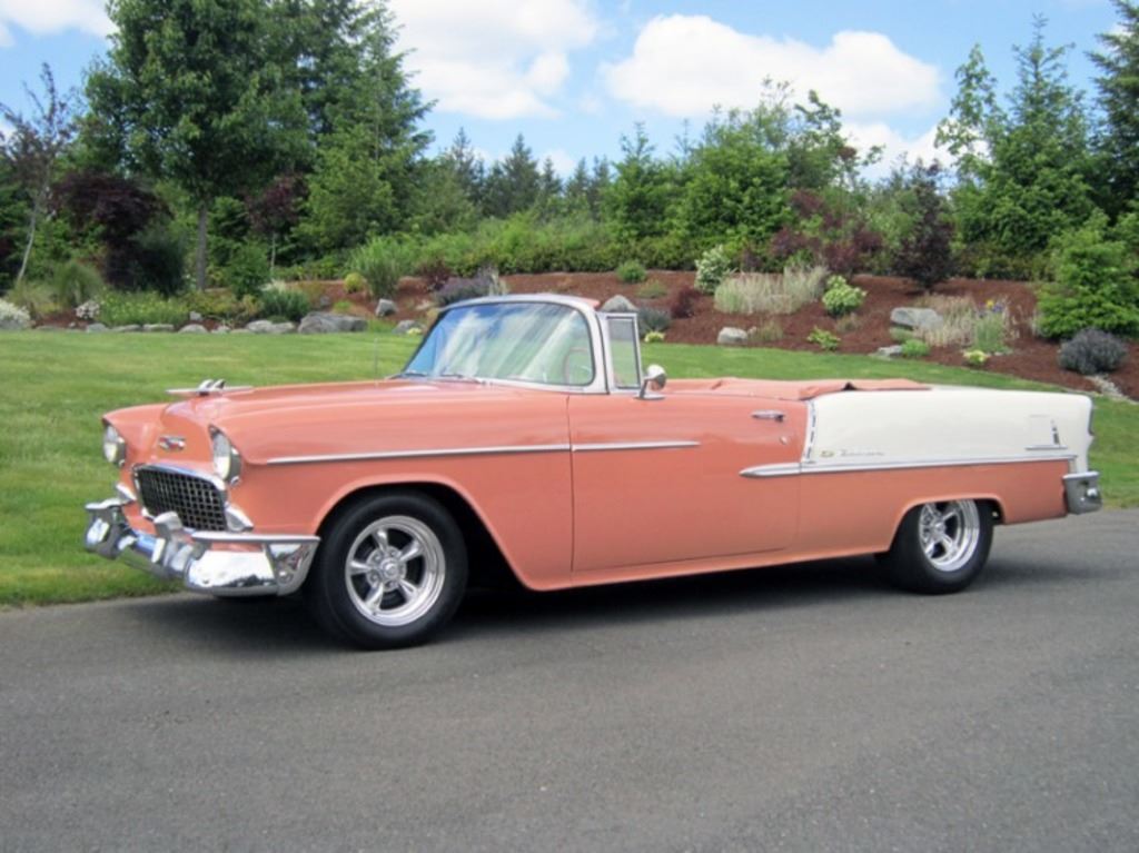 1955 Chevrolet Belair Convertible.. •......Rebuilt 265 V8 engine. •......2-speed automatic. •......Power brakes. •......Power steering. •......Rare power seat. •......Power convertible top. •......Upgraded AM-FM radio. •......New stock upholstery. •......Outstanding chrome, glass and trim. •......Polished torque thrust alloys. •......Refinished in the original coral and beige. •......Beautifully restored throughout