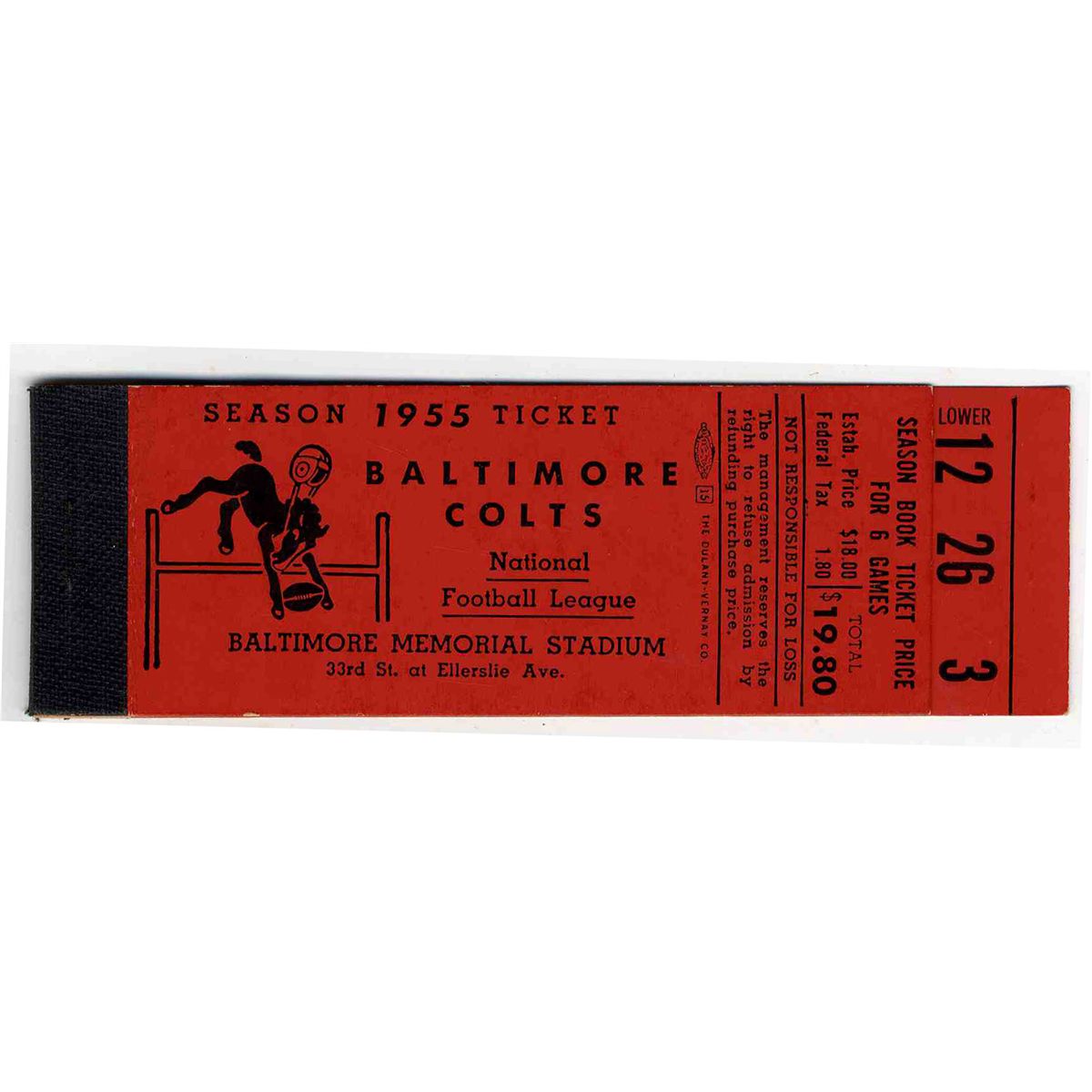 1955 Baltimore Colts Season Ticket Booklet -- All Tickets For Lower Section Seats Removed -- 5.5'' x 1.75'' -- Fine Condition