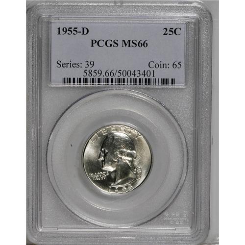 <B>1955-D<25C> MS66 PCGS.</B></I> A satiny and untoned example with glistening devices. Solidly struck with no noteworthy marks. Magnificently preserved, and PCGS has graded none finer (6/06).