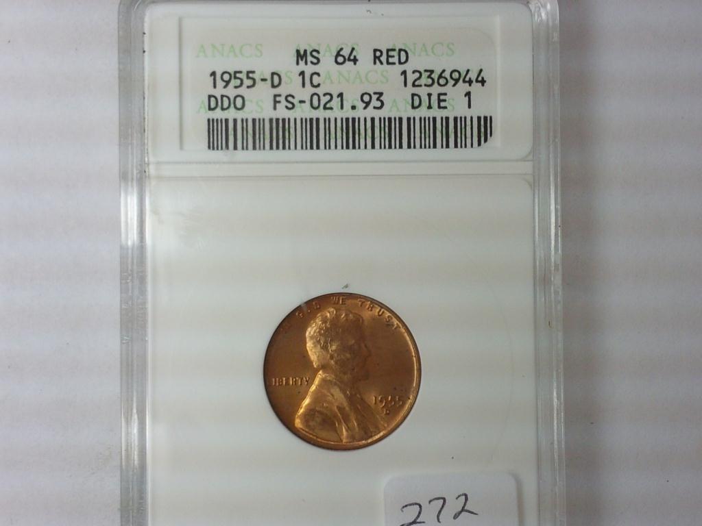 1955-D DDO DIE 1 LINCOLN CENT ANACS MS64RED