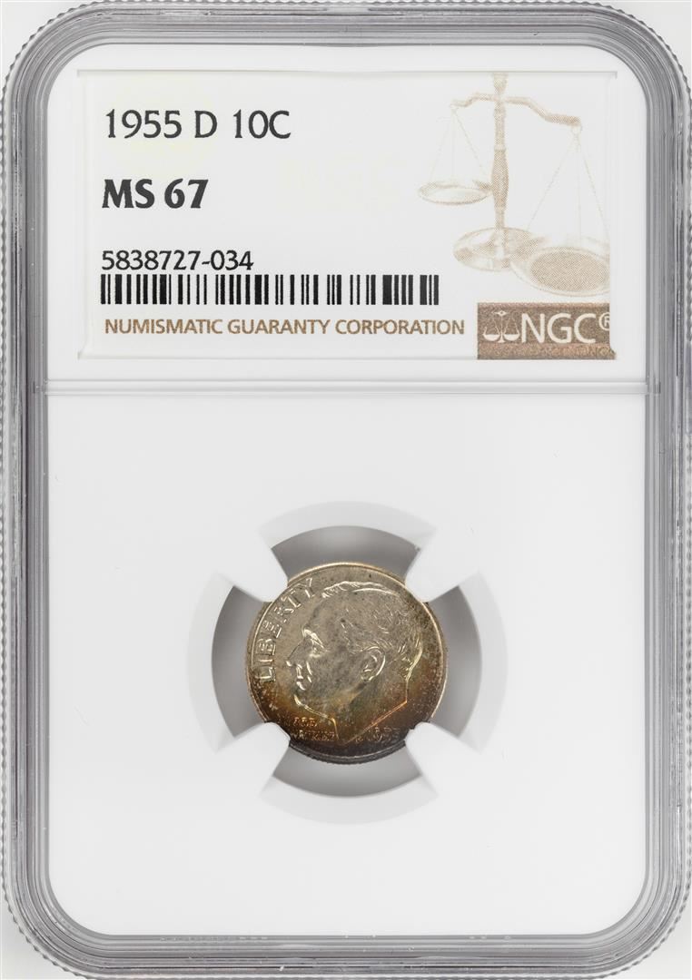 One 1955-D Roosevelt Dime Coin NGC MS67 Nice Toning. NGC Certified.