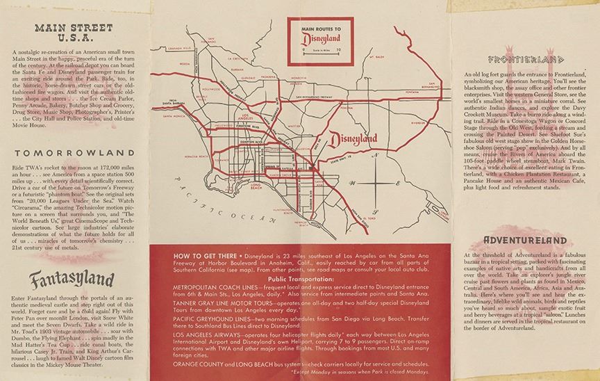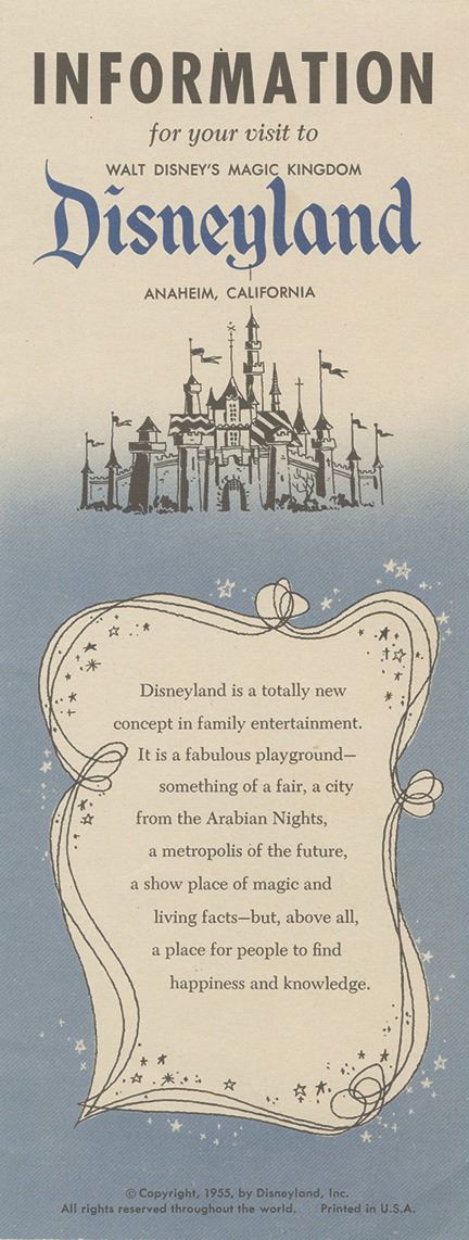 (Disneyland, 1955) A very rare opening year gate flyer for Disneyland. This flyer features early graphics used to promote the park, an inside map to Disneyland, and information about the park's various lands. The flyer measures 9"x3.5" folded, and is in very good condition with minor wear from use.
