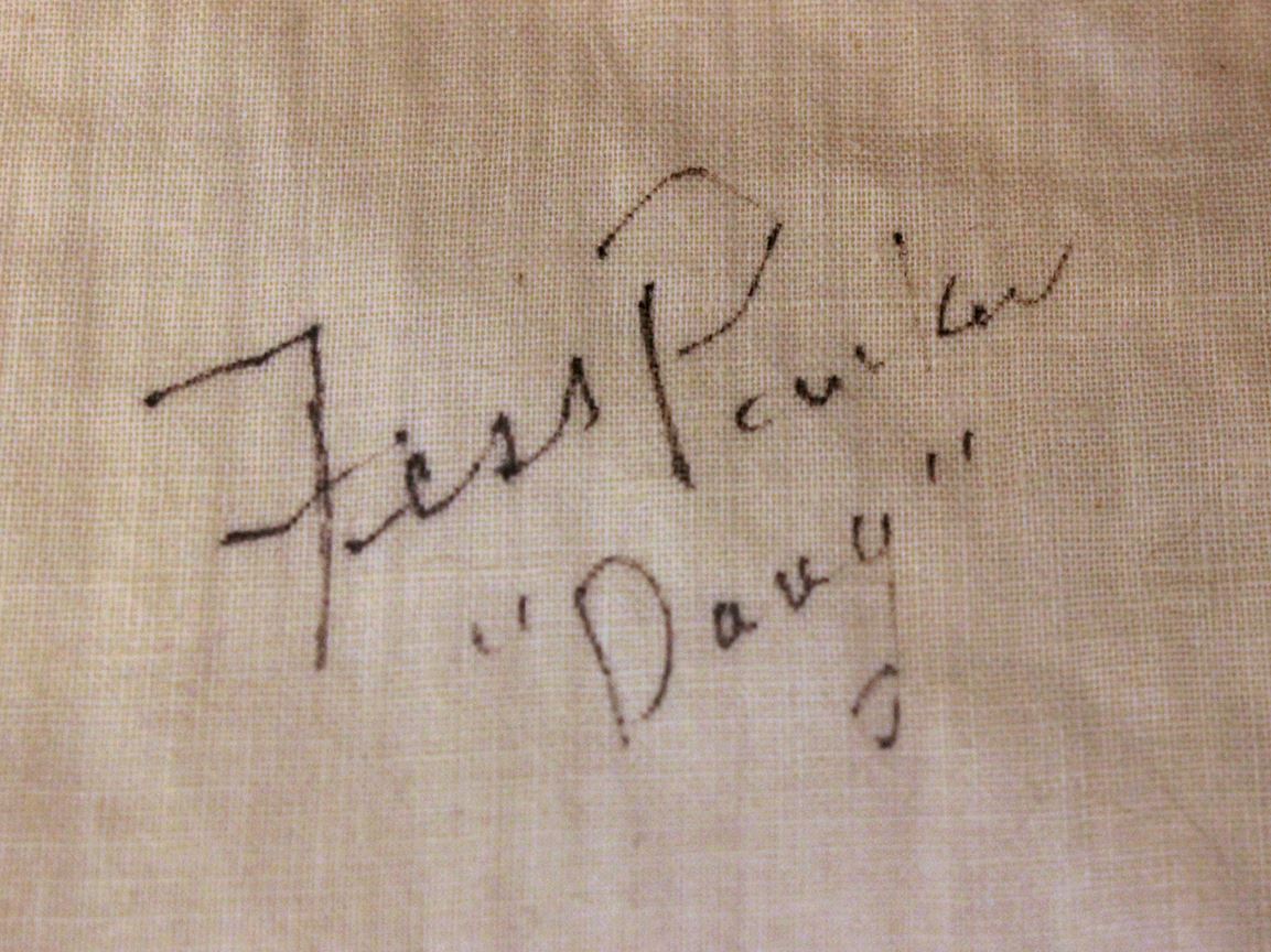 (Disneyland, 1955) A very scarce silk-screened flag that decorated the Davy Crockett Frontier Museum and Mercantile in Frontierland on opening day of the park and throughout the next year. At the time the park opened, Disney’s Davy Crockett franchise, starring Fess Parker, had grown to record breaking status in popularity. To meet the consumer demand for everything Davy Crockett, Walt made sure the “King of the Wild Frontierland” had a major presence in the park. The Davy Crockett Frontier Museum featured historic artifacts, props, and a deluge of merchandise to appease the masses. This flag was hand-signed by Fess Parker and was acquired by the collection owner directly. Measuring 13 x 17 in. and in good condition with wear from use.