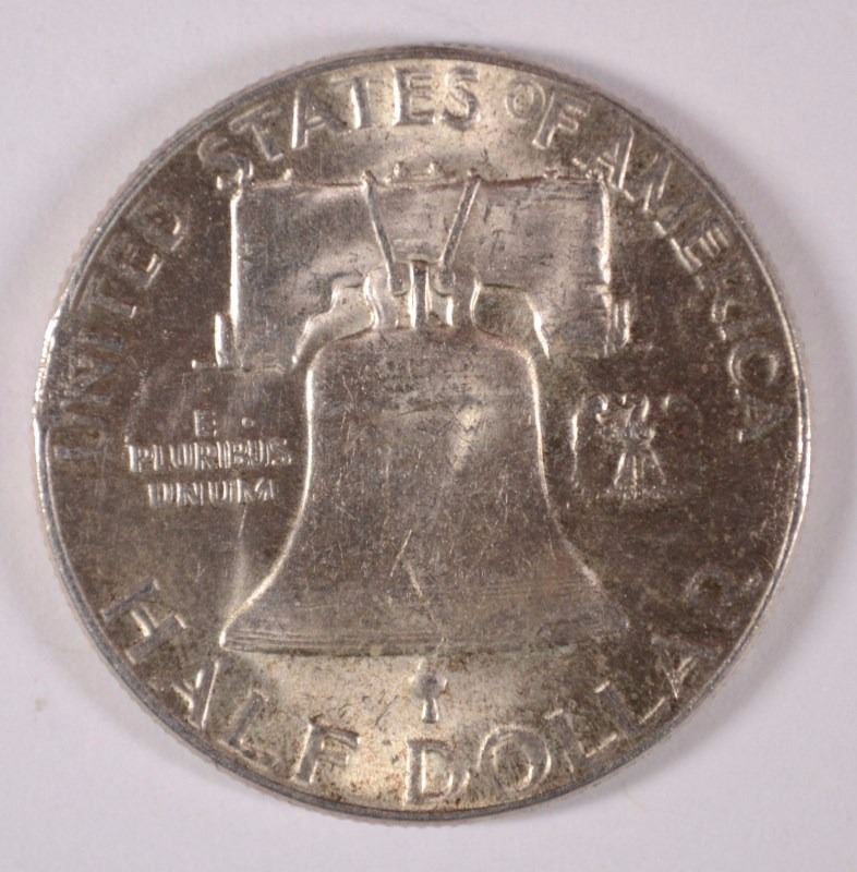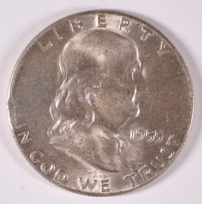1955 FRANKLIN HALF DOLLAR, CHOICE BU MINT ERROR, CLIPPED PLANCHET IN "UNITED"