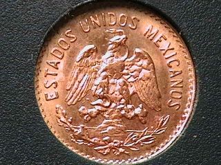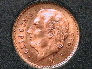 1955 Five Peso Gold AU-Unc. Popular cent sized gold piece from Mexico. Actual gold content is .12057 Ounces