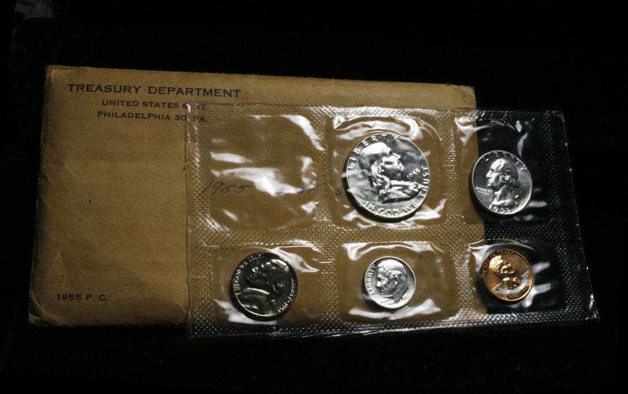 A cool error 1955 Flat Pack. I've never seen this before, it is a sealed 1955 flat pack, all fully sealed cellophane, but the little metallic mint seal section is empty! A Mint error, Cool! Also in the set is a CAMEO Washington Quarter. Estimated Value $200