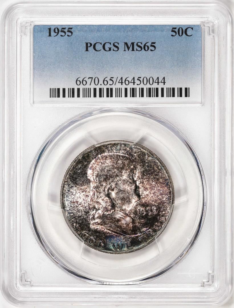 One 1955 Franklin Half Dollar Coin PCGS MS65 Great Toning. PCGS Graded.
