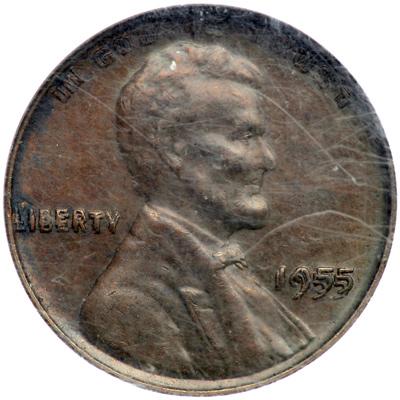 1955 Lincoln Cent. Doubled die obverse. NGC graded MS-61 Brown. Uniform drark reddish-brown with a few areas of black verdigris along the rim. Impressive doubling on the obverse.