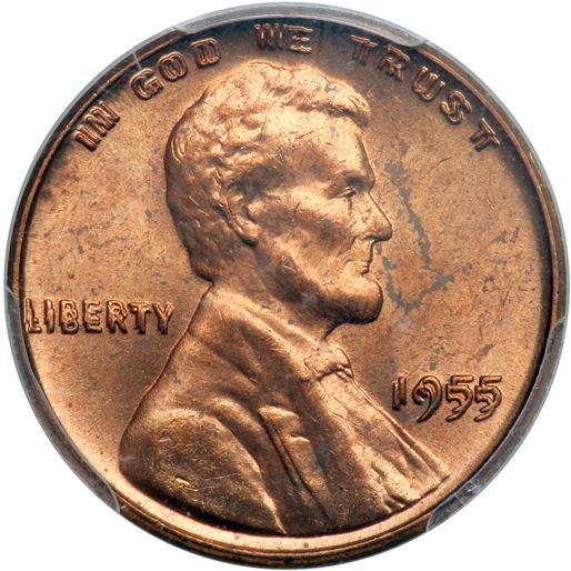 A fiery red, almost pristine example of one America's most celebrated modern rarities! The story of the 1955 Doubled Die penny has caused countless numbers of children and adults to religiously rummage through their change. Produced by problems that arise during the multiple softenings and hubbings that occur during the production of a die, the 1955 is believed to have been produced during a graveyard shift the summer of that year (PCGS # 2827) .