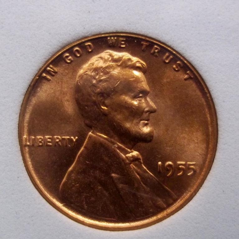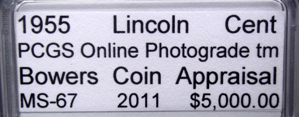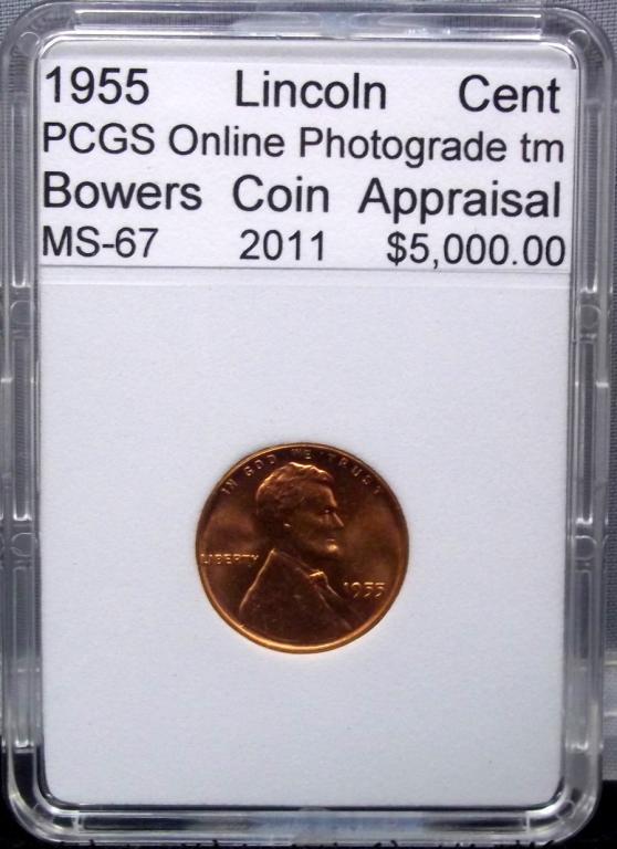 Brilliant 1955 Philadelphia Mint Lincoln Cent, PCGS Online Photograde Mint State-67, appraised by Bowers Coin Appraisal; $5,000.00. A beautiful coin from the recently discovered “Phoenix Hoard”.