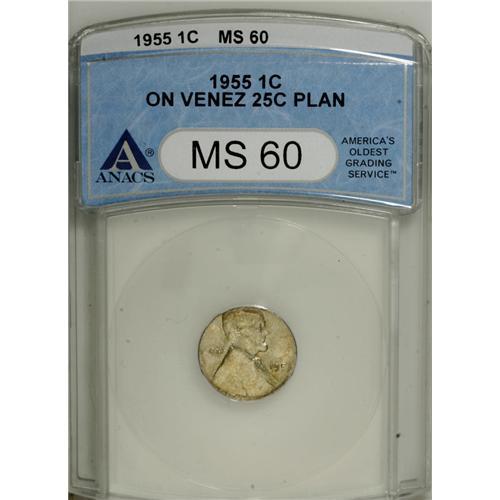 <B>1955 Lincoln Cent--Struck on Venezuela 25c Planchet--MS60 ANACS.</B></I> This is an interesting mint error which features a Lincoln cent struck on a Venezuela 25 centavos planchet. The peripheral elements of the Lincoln cent design are off of the planchet, and only the E in ONE and half of the E in CENT are present on the reverse. ST and AMER are very weak, and only parts of E and UM can be discerned along the upper periphery. A grazing mark near the right obverse border resembles the number 4. Lustrous and lightly toned; an attractive Uncirculated error coin.<BR><I>From The Dale A. Konigsburg Collection, Part Two.</B></I><BR><BR><b>Shipping:</b> Coins & Currency (<a target="_blank" href="http://www.heritageauctions.com/common/shipping.php">view shipping information</a>)