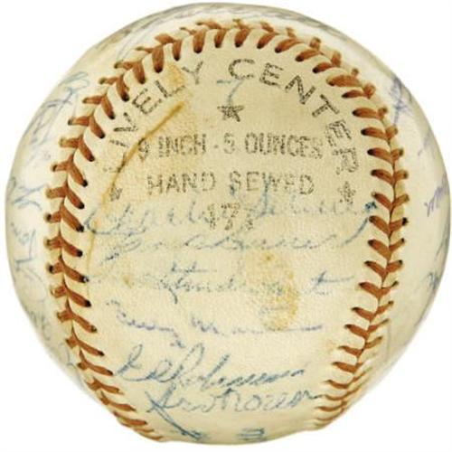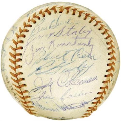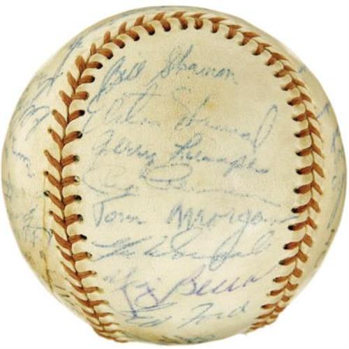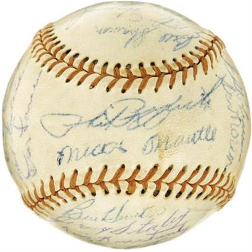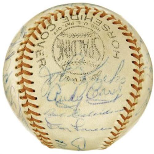 <B>1955 New York Yankees Team Signed Baseball.</B></I> Though the Brooklyn Dodgers would finally take their revenge for five consecutive World Series losses this season, the Bronx crew featured upon this non-official sphere represents one of the finest to wear the pinstripes. Hall of Fame talent like Mantle (in his early and desirable format), Rizzuto, Berra and Ford is joined by the likes of Larsen, Howard, Martin, Skowron, Carey and Richardson. Twenty-nine autographs are here in total, with most rating 8/10 (and none below 6/10). A fine keepsake from the golden era of New York City baseball. <I>LOA from PSA/DNA. LOA from James Spence Authentication.</B></I><BR><BR><b>Shipping:</b> Balls, Pucks, etc., Small (<a target="_blank" href="http://www.heritageauctions.com/common/shipping.php">view shipping information</a>)