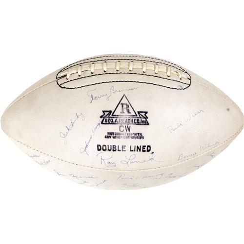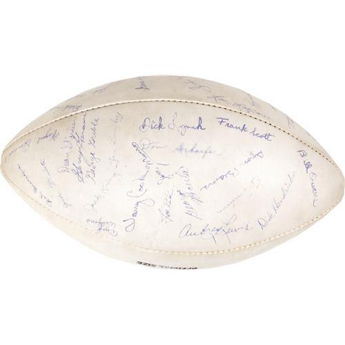 <B>1955 Notre Dame Fighting Irish Team Signed Football.</B></I> High-grade pigskin remembers a powerhouse NCAA squad that ruled the gridiron a half-century ago, finishing eight and two with rankings of ninth and tenth in the nation by AP and UPI respectively. Most notable among the almost fifty autographs are that of Paul Hornung, who would go on to Hall of Fame greatness as a member of Vince Lombardi's Green Bay Packers, and coach Terry Brennan. Also here are Schaefer and Bisceglia Unbelievably, only a couple of the autographs (and not Hornung or Brennan) dip below an 8/10 rating, setting this white-paneled ball at the absolute pinnacle of the small supply of similar specimens. Notre Dame alumni should be ashamed of themselves if they let this rare opportunity pass by without placing a serious bid. <I>LOA from PSA/DNA.</B></I>