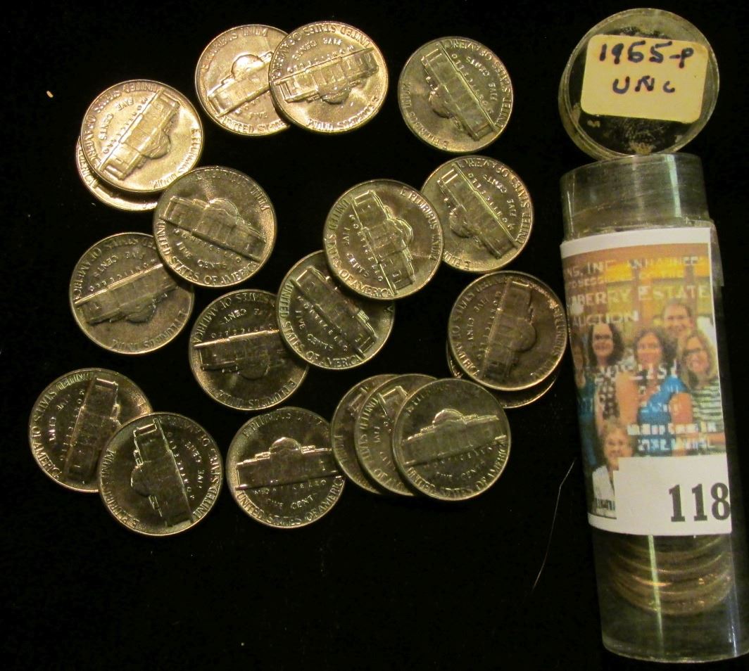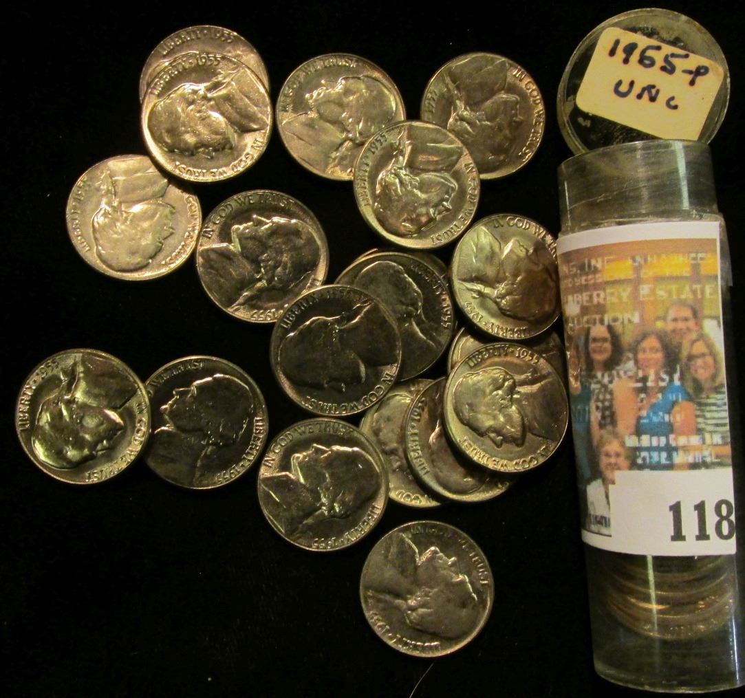 1955 P Solid date Gem BU Roll of Jefferson Nickels stored in a plastic tube.