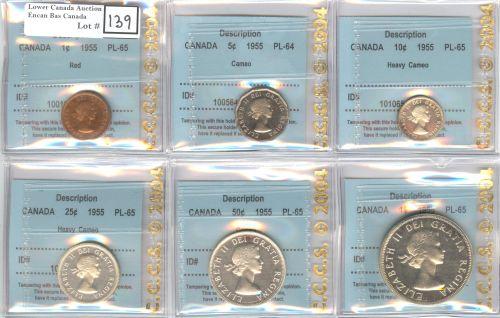 1955 Individually CCCS certified PL-65: 1¢ Red, 5¢ Cameo (PL-65), 10¢ Heavy Cameo, 25¢ Heavy Cameo, 50¢ Cameo, $1 Cameo
