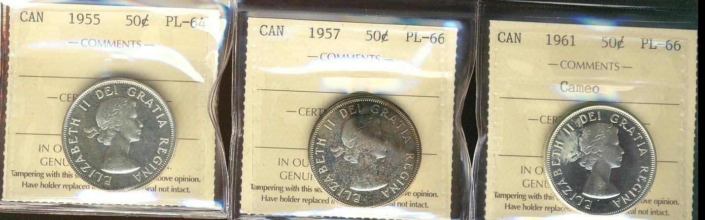 1955 PL64, 1957 & 1961 50¢ PL66. Lot of 3 ICCS graded coins with 1961 designated Cameo.