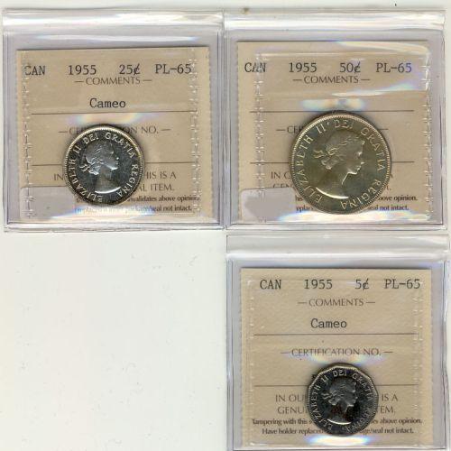 1955 Partial proof-like set. Includes a 1955 5¢ PL65 Cameo, 1955 25¢ PL65 Cameo, 1955 50¢ PL65. All three coins are ICCS graded.