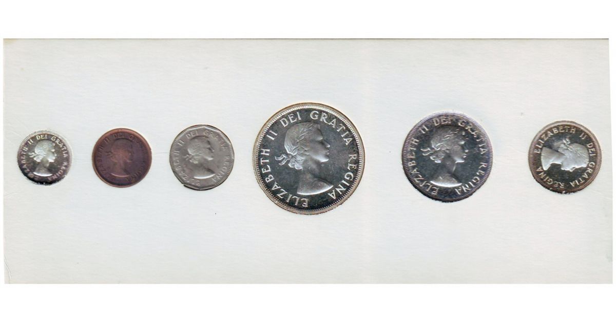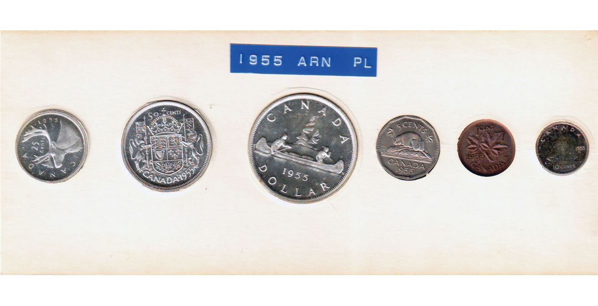 1955 Proof Like in white cardboard, cent Red & Brown Shoulder Fold, dollar is Arnprior.