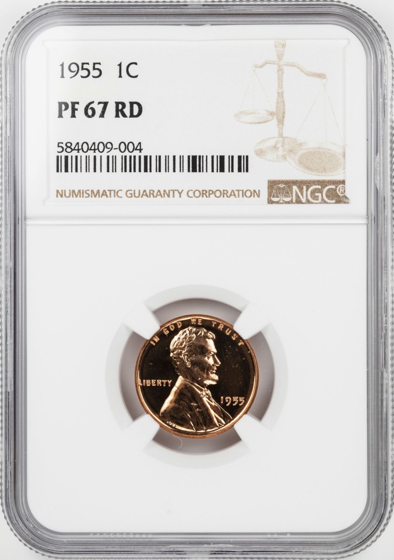 One 1955 Proof Lincoln Wheat Cent Coin NGC PF67RD.