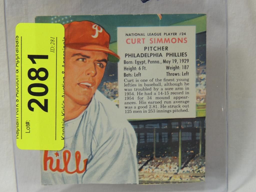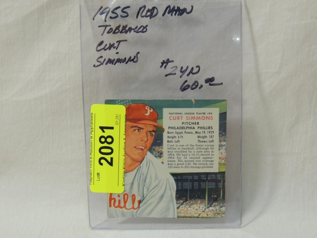 1955 RED MAN TOBACCO CURT SIMMONS #24N BASEBALL CARD. BASEBALL COLLECTIBLE. VINTAGE CARD. GOOD CONDITION. IN PLASTIC SLEEVE. AS SHOWN. SEE PHOTO FOR MORE DETAILS.