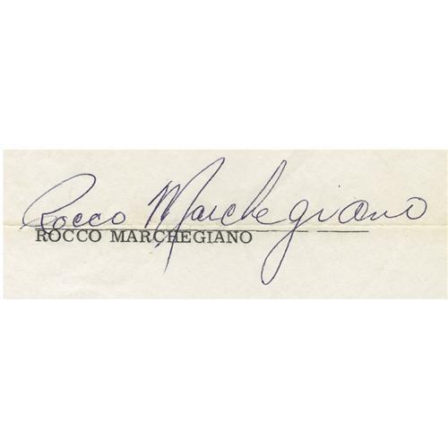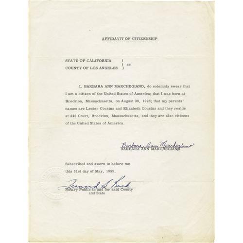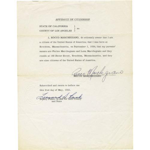 <B>1955 Rocky Marciano Signed Affidavit of Citizenship.</B></I> For many autograph collectors, nothing tops a signed official document for the unquestionable authenticity it assures. Here we present just such a piece, offering the only undefeated Heavyweight Champ's rare "birth name" signature, a booming 10/10 blue ink "Rocco Marchegiano." He signs this 8.5x11" sheet to attest to his United States citizenship, likely for some sort of travel documentation. Also here is an essentially identical affidavit signed by his wife Barbara Ann. Each is signed and stamped by the notary witnessing the signing. Pages show mild edge wear and toning that would be invisible upon framing, allowing for a NRMT presentation. <I>LOA from PSA/DNA. LOA from James Spence Authentication.</B></I><BR><BR><b>Shipping:</b> Flat Material, Small (<a target="_blank" href="http://www.heritageauctions.com/common/shipping.php">view shipping information</a>)