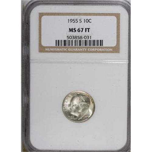 <B>1955-S 10C MS67 Full Torch NGC.</B></I> A highly lustrous pearl-gray Superb Gem with wisps of charcoal patina along the borders. A sharply struck and original example from the final year of mintmarked business strike dime production from the San Francisco Mint. Census: 15 in 67 Full Torch, 0 finer (9/07).<BR><BR><B>Coin Engraver:</B> John R. Sinnock<BR><BR><b>Shipping:</b> Coins & Currency (<a target="_blank" href="http://www.heritageauctions.com/common/shipping.php">view shipping information</a>)