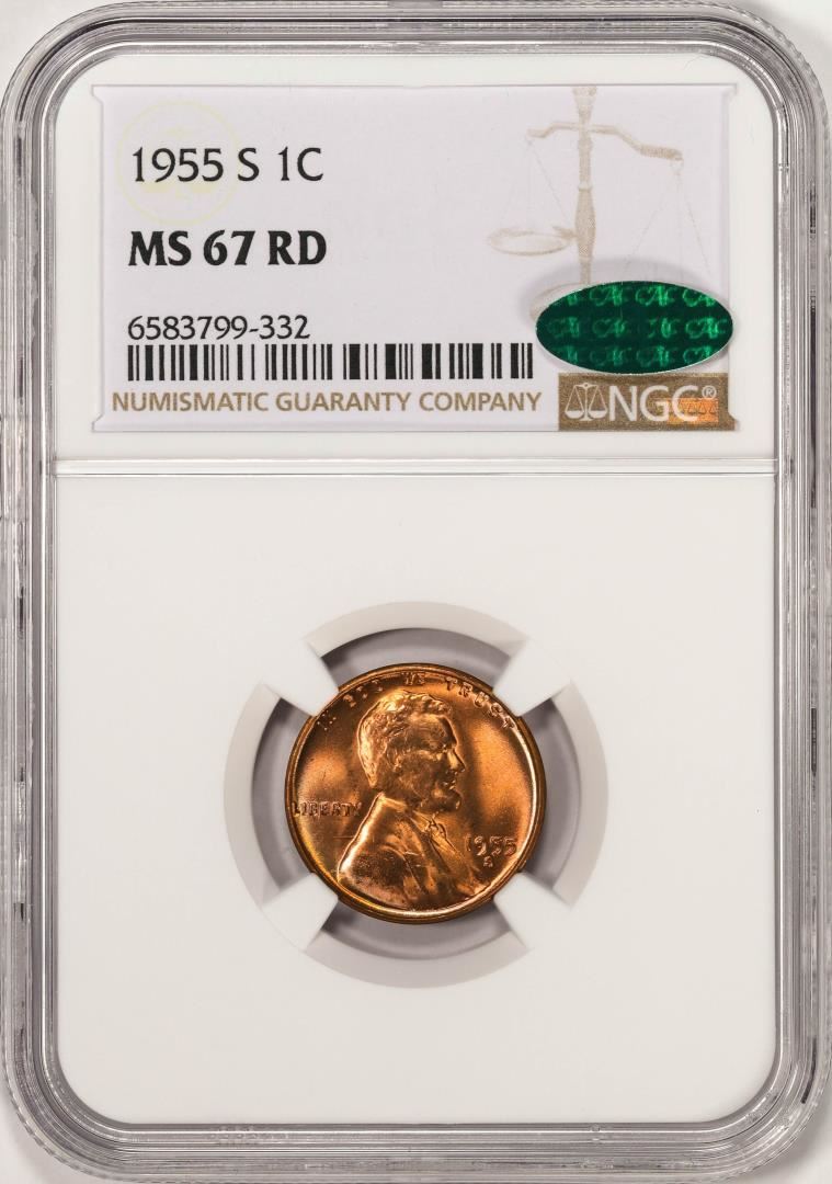 One 1955-S Lincoln Wheat Cent Coin NGC MS67RD CAC. NGC Certified.