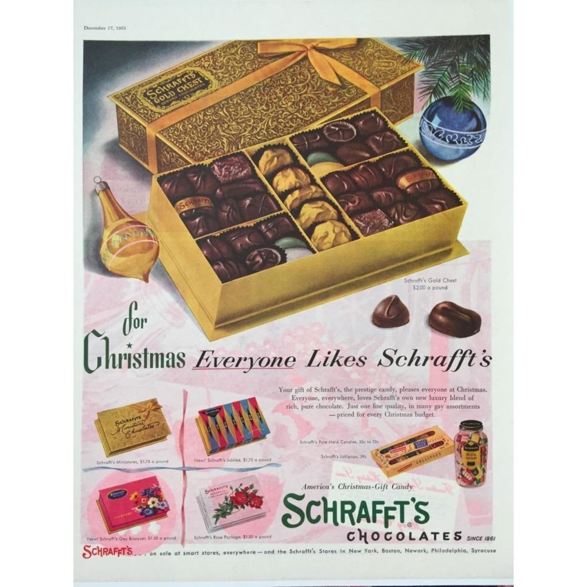 Original 1955 magazine advertisement for Schrafft's Chocolates. Features a gold box under a Christmas tree, with pricing from $1.25 - $1.75 per pound. 10 1/2" X 13 1/2" mounted on archival linen canvas forpreservation.