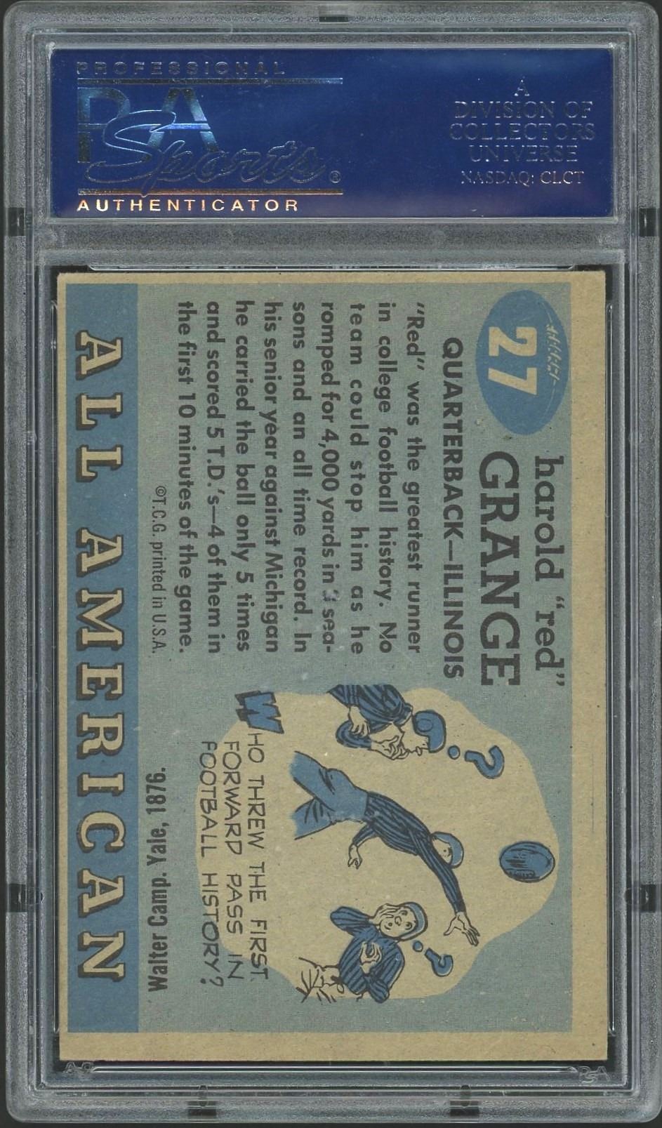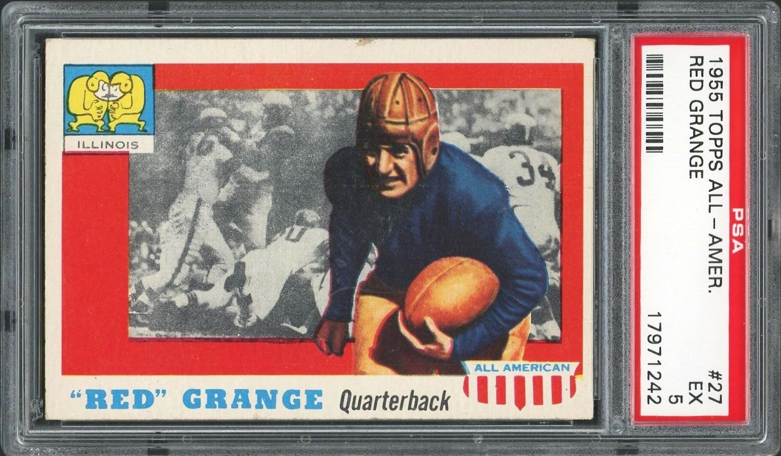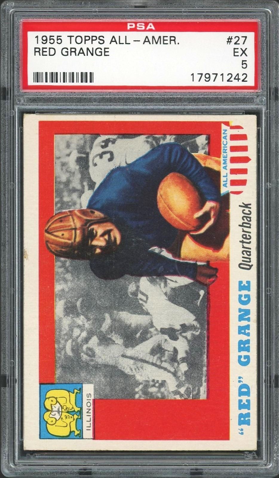 Key card from the classic 1955 Topps All-American set, featuring all-time great and football legend from the Golden Era of Sports, Red Grange. Graded 5 EX by PSA!