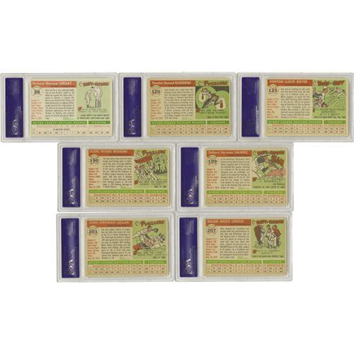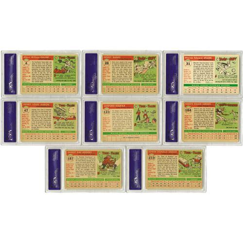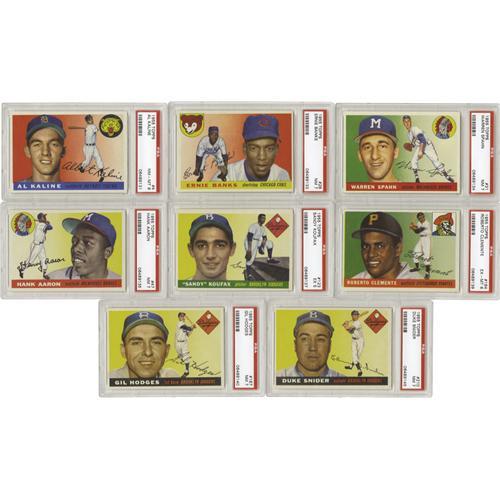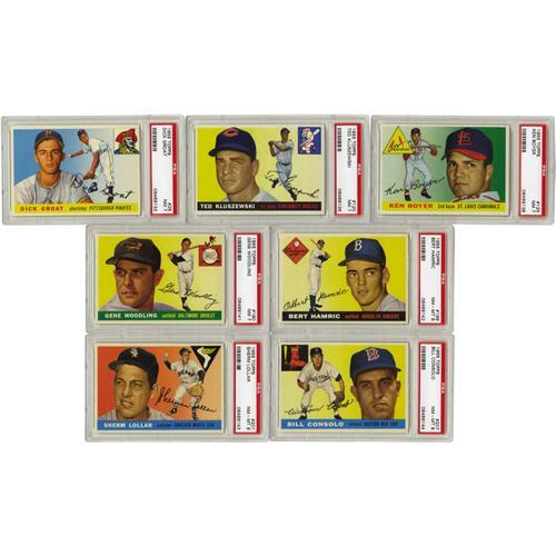 <B>1955 Topps Baseball Complete High-Grade Set (206).</B></I> Numerically the smallest of Topps annual issues, the 1955 issue consists of 206 horizontal-oriented cards. Card numbers 175, 186, 203 and 209 were never released. A total of 15 cards have been graded by PSA with an aggregate SMR value of $3957. Graded cards - <B>PSA 8:</B></I> #4 Kaline, 199, 201 Lollar, 207; <B>PSA 7:</B></I> #26 Groat, 28 Banks, 31 Spahn, 47 Aaron, 120 Kluszewski, 125 Boyer, 187 Hodges, 190 Woodling, 210 Snider; <B>PSA 6:</B></I> #164 Clemente, <B>PSA 5:</B></I> #123 Koufax. Ungraded cards include #1 Rhodes (EX), 2 Williams (VG/EX), 50 Robinson (VG/EX), 75 Amoros (EX), 100 Irvin (EX/MT), 124 Killebrew (VG/EX), 152 Agganis (EX), 155 Mathews (EX), 189 Rizzuto (EX), 194 Mays (EX), 198 Berra (EX). Set grades 33% NM to NM/MT, 59% EX to EX/MT, 8% VG to VG/EX (some lesser).