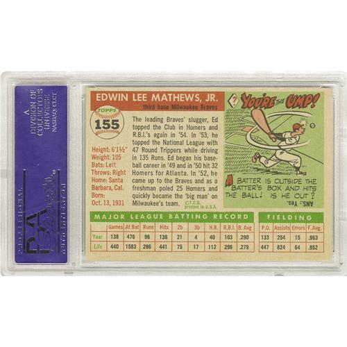 <B>1955 Topps Eddie Mathews #155 PSA Mint 9.</B></I> It's tough to imagine a nicer Mathews card from this fan-favorite set, and it's clear that the graders at PSA haven't seen one--not a single representation tops this Topps in the population report. Stepping beyond a pack-fresh goodness that offers razor-sharp corners and silky gloss, this one boasts terrific centering and flawless image registration. A Hall of Fame card in more ways than one.
